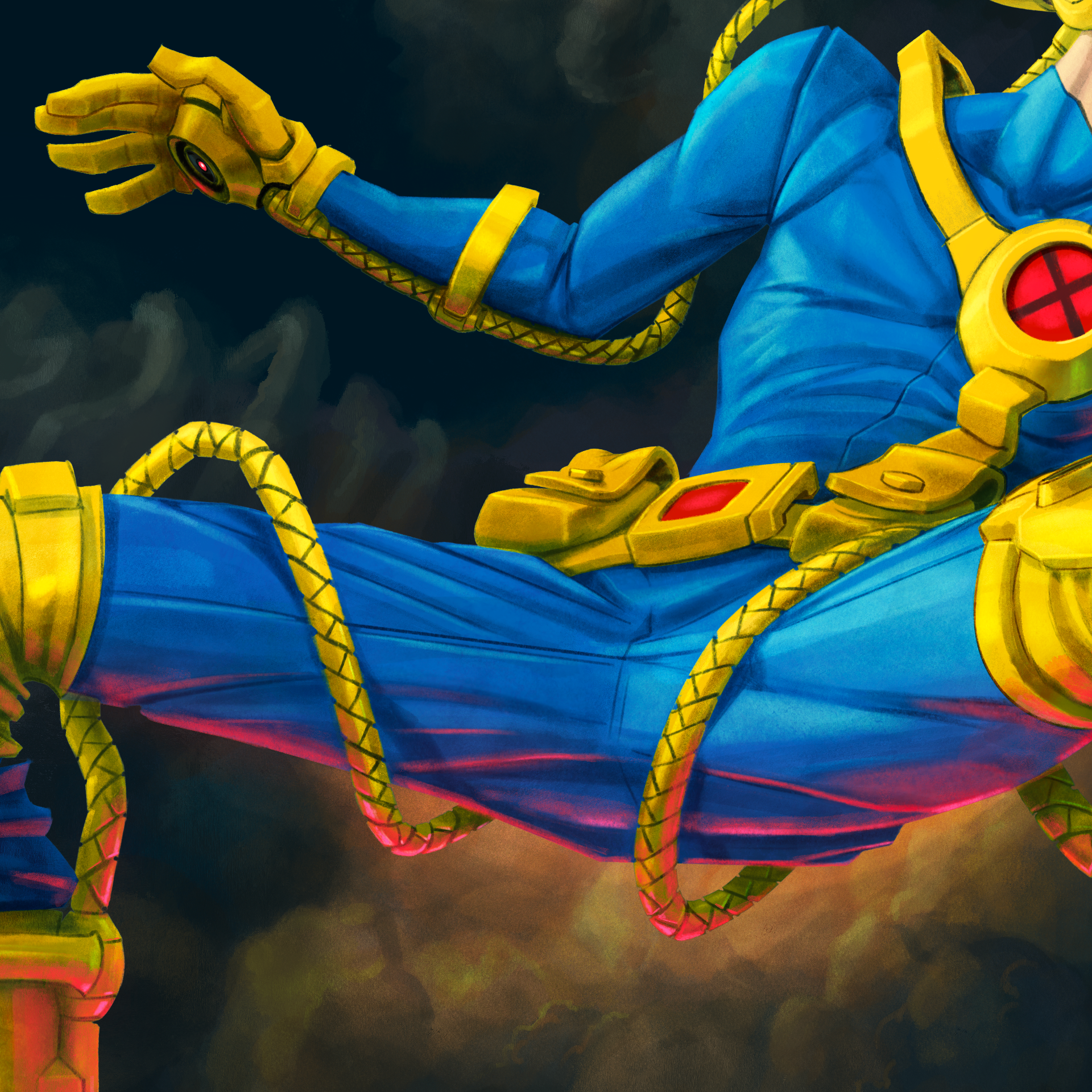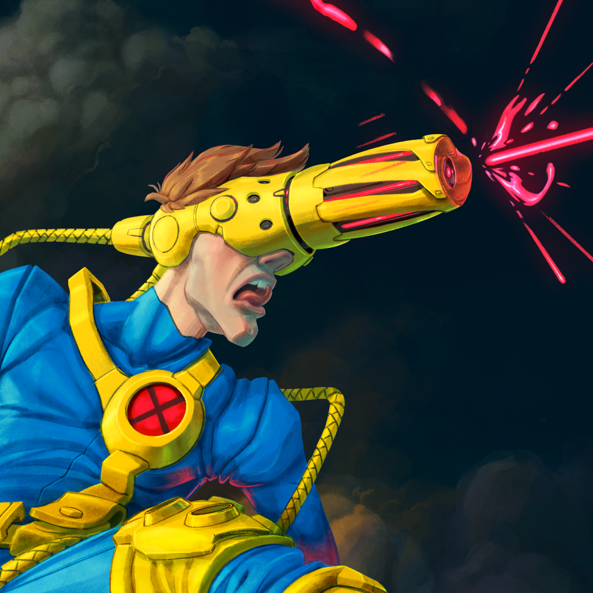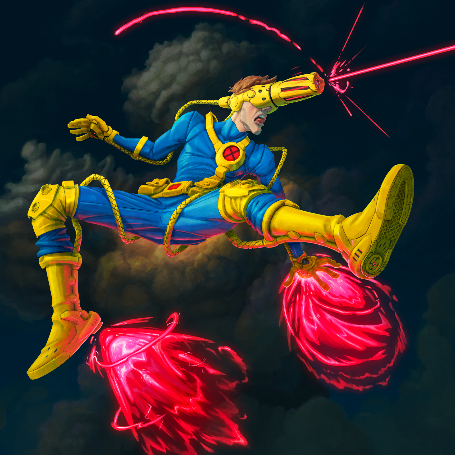 I don't know what drove me to draw this particular member of the X-men, but this is how I always thought Cyclops' gear could work, at least according to headcannon (get it?). I've always thought that if his headgear could control or focus his optic wrath, perhaps they could also be ducted to his other extremities to perform useful functions, a la iron man. But maybe this makes him more of a DnD Beholder than a "cyclops"? I do know I've wanted to try my hand at redesigning him for a while. I also always thought he would be more fun if he were a bit of a dork, and I hope that comes across. That's why I left a couple pouches and imagined that he sticks his tongue between his front teeth when he's concentrating.